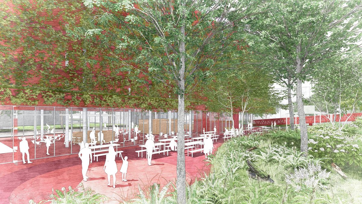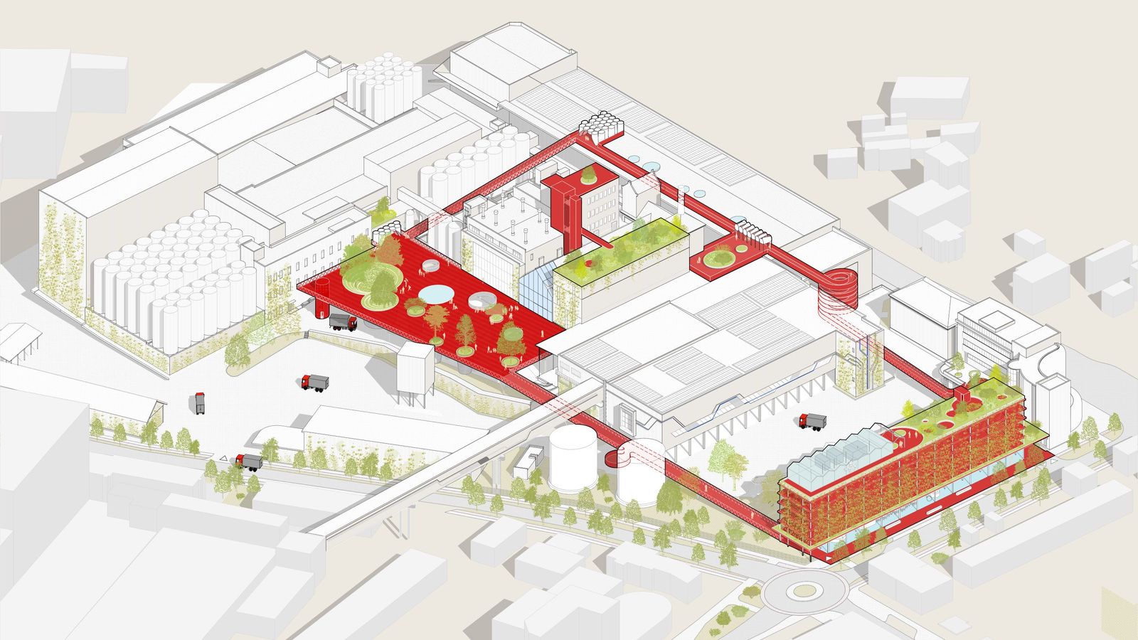 The malthouse, the heart of the brewery, opens up towards the brewery square through a sunlit glasshouse with lush tropical vegetation, serving both entrance and vertical circulation. offering seating possibilities, it is open and ventilated in the summer, while heated by the adjacent brewery hall in winter.