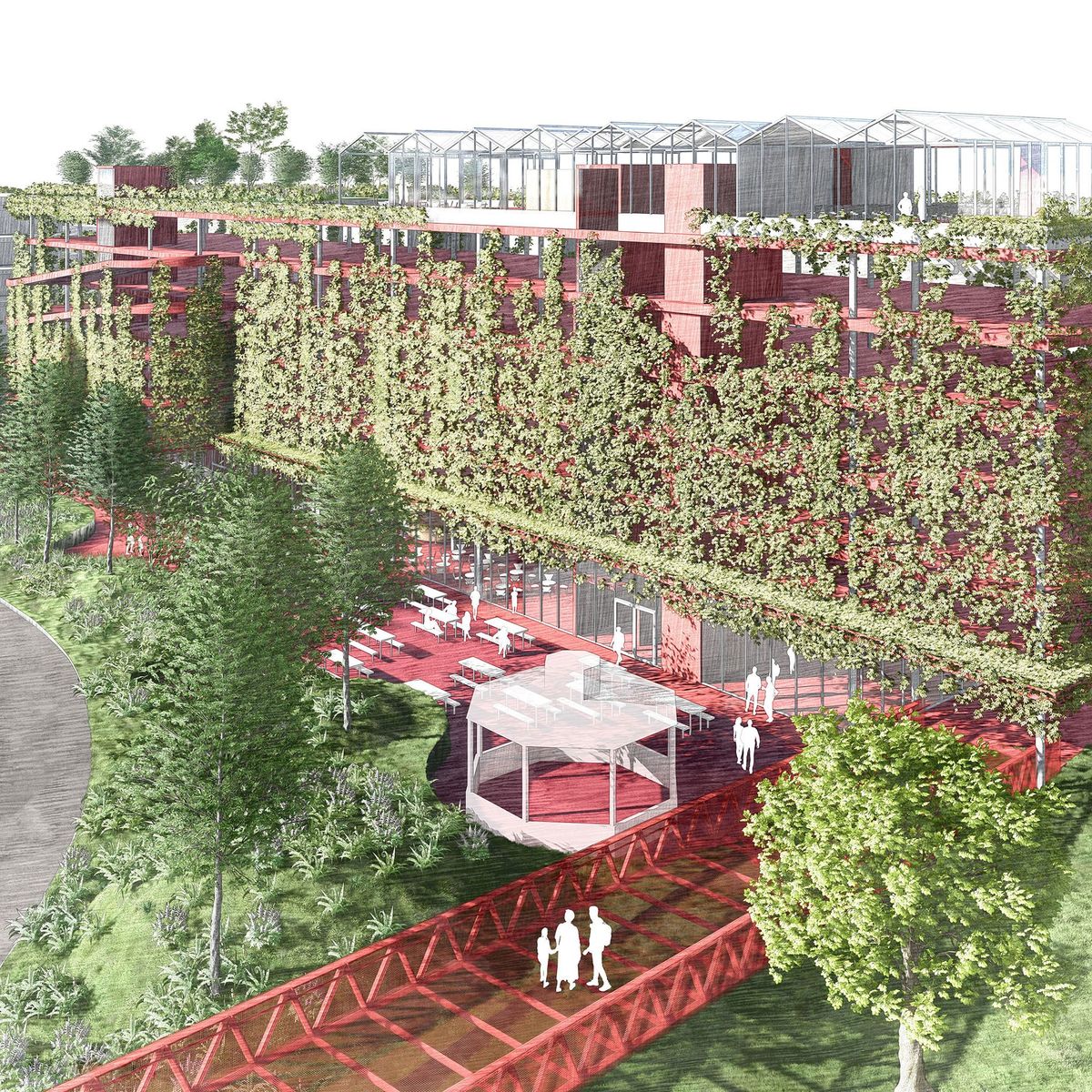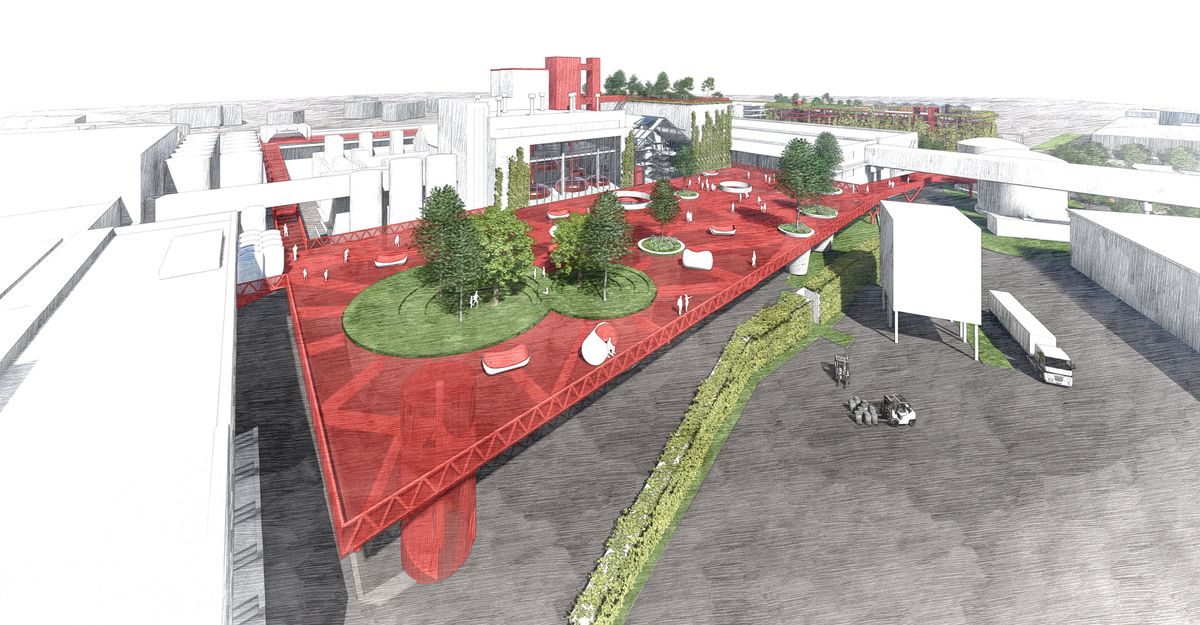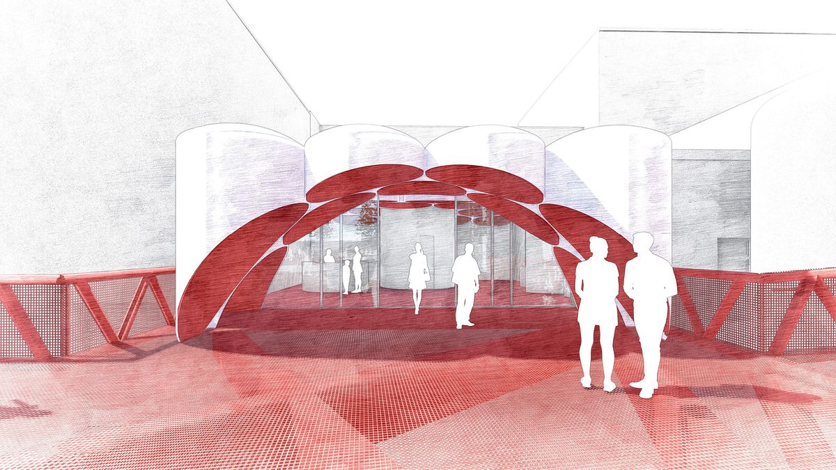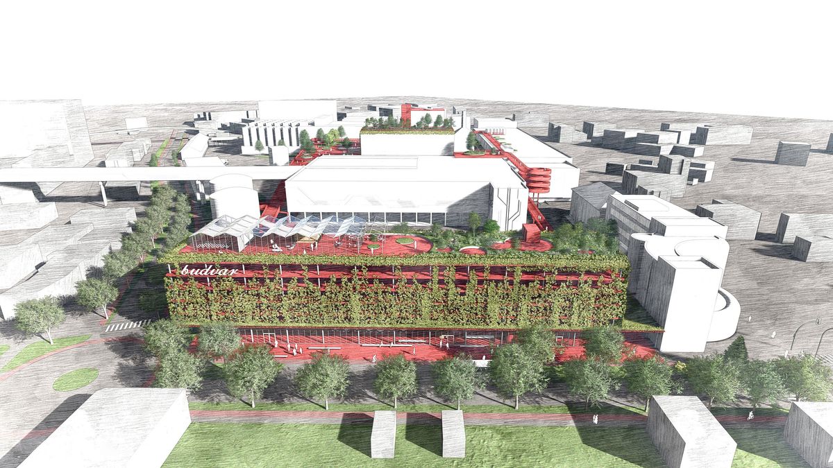 With it’s strong colour identified with Budvar the skywalk connects the attractions like a red carpet. Series of long spanning ramps allow a barrier free access to the whole area. The steel construction ensures low maintanance longevity, and easy assembly. The versatile application of open metal mesh - as railing and flooring - simplifying water evacuation. The brewery square is a key feature giving access to the malthouse and the cellars and direct views into the brewery hall. It's parametric spider web-like construction is supported by giant concrete tree planters, that allow full scale trees to cast their shade.