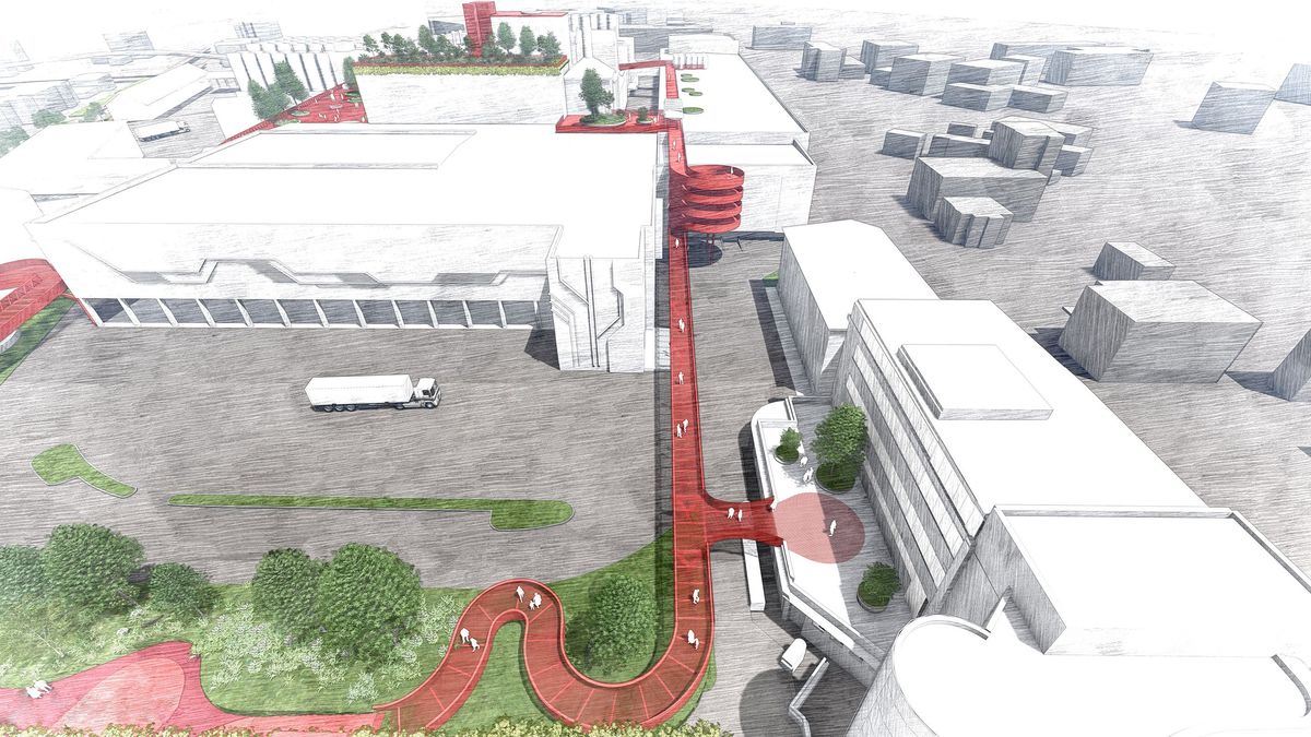 The proposed welcome center location ensures a single, easily controlled access for visitors while avoiding a conflict between the truck traffic of the logistics and the cars and buses of tourists. A roundabout at the junction of Karoliny Svetle / Knezskodvorska and a mandatory right turn when exiting the parking prevents trafficjams at the traffic light to prazska street. A pedestrian and biker friendly design upgrade enhances Karoliny Svetle and Knezkodvorska, and a new pedestrian/bike connection through a renaturalised water stream on the northern side of the areal. The green volume of the welcome center can be extended to the corner of Prazska/Karoliny svetle replacing the existing administration building, while reserves for future brewery expansion are secured.
